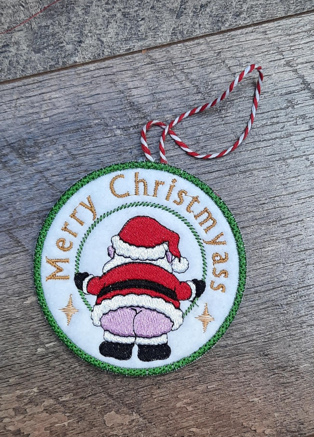 Felt Christmas decorations, machine embroidered. Hanging string in coordinated colours.